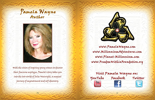 My vision is to motivate young women to discover their femine mystique. My novel, Julia Wainright, Girl In Two Worlds, takes you into the two worlds of Julia, a teenage girl's journey of empowerment and self-discovery. Enjoy the story, available in five editions: the standard 6 x 9, illustrated b&w; the 8.5 x 11, color, deluxe edition; the illustrated ebook; the PDF color digital edition; and the full-color flipbook. "There is no way to happiness; happiness IS the way." With love, Pamela Wayne
